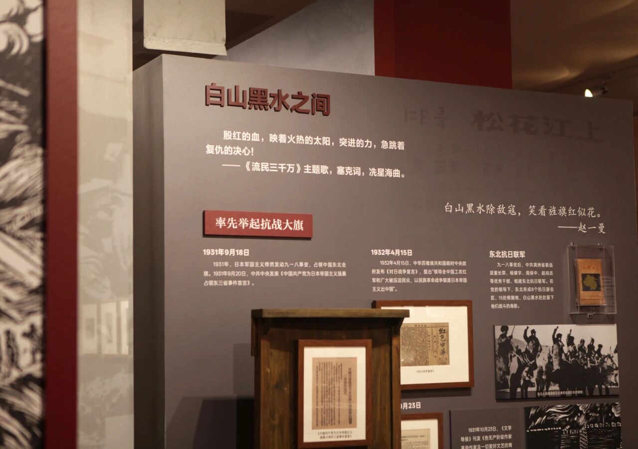 第一单元聚焦近代中国从沉沦到觉醒的历程。“黑暗的一页”展区展示1894-1931年间的抗战文学书籍与期刊和宣言,如陈天华《猛回头》、曾朴《孽海花》等经典作品;“白山黑水之间”通过东北抗日联军史料、“东北作家群”作品,如萧红《生死场》、萧军《八月的乡村》等,展现东北军民的英勇抵抗与文学力量;“不愿做奴隶的人们”打造“风云儿女”声音剧场,以《义勇军进行曲》《松花江上》等经典抗战歌曲,搭配淞沪抗战、长城抗战、一二九运动的历史照片与文学创作,重现全民族救亡图存的激昂岁月。   第二部分“抗到底”