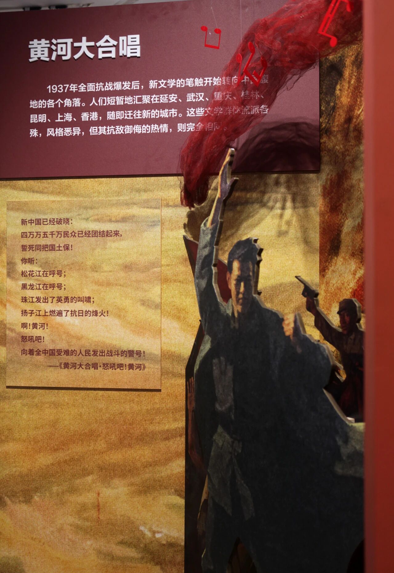 第二单元围绕全民族抗战展开。通过《台儿庄纪事》手稿、《中国共产党为公布国共合作宣言》、徐悲鸿致盛成的信等展品,结合《保卫卢沟桥》话剧史料,还原抗日民族统一战线正式形成的历史场景;“黄河大合唱”展区将激昂音乐与置景相融,迸发直击人心的震撼力量。展览系统呈现抗战时期延安、重庆、桂林、昆明、上海及港台六大区域的文艺创作成果,集中展出老舍《四世同堂》、王礼锡《笔征日记》、闻一多《九歌(古曲翻新)》、阳翰笙《天国春秋》等多部馆藏一级文物手稿,堪称抗战文艺的珍贵缩影。