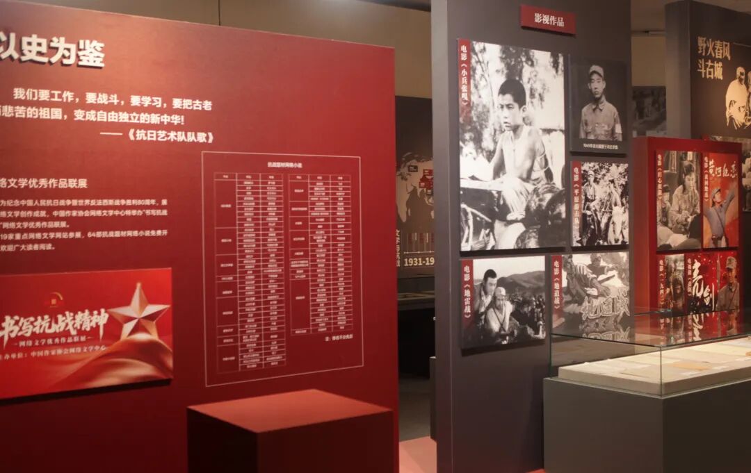 第五单元立足当下,传承和平理念。选取《血战台儿庄》《地道战》《1942》《南京!南京!》等近20部抗战经典影视作品片段,搭配管桦《小英雄雨来》手稿、徐光耀《小兵张嘎》手稿等实物,呈现战争结束后的经典书写与时代回响。同时集中展示了“书写抗战精神”网络文学优秀作品。