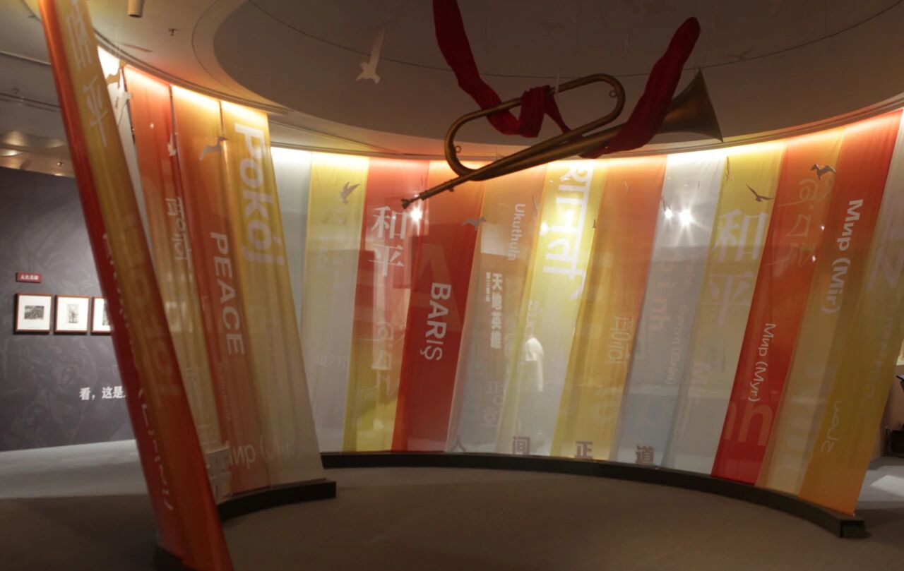 “和平虹光”中心装置,展示了巴金、老舍等作家的和平金句,设置镜面屏幕供观众留言,传递对和平的共同期盼。
