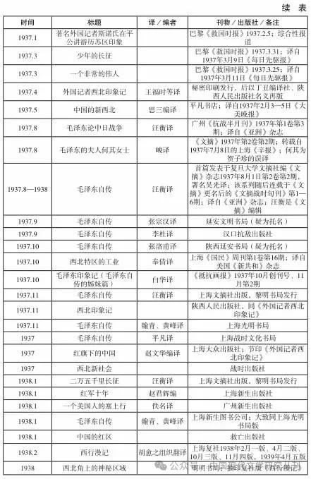 [8]本表基于对书目、数据库、回忆录及二手研究的广泛调查。包括:《民国时期总书目:中国文学,世界文学,文学理论》《中国现代文学总书目 翻译文学卷》;“全国报刊索引”数据库、CADAL数据库;张小鼎《〈西行漫记〉在中国的流传和影响——〈红星照耀中国〉重要中译本50年书话》,《图书馆学通讯》1988年第3期;吴明《〈西行漫记〉版本评介》,《北京党史研究》1993年第2期;等。
