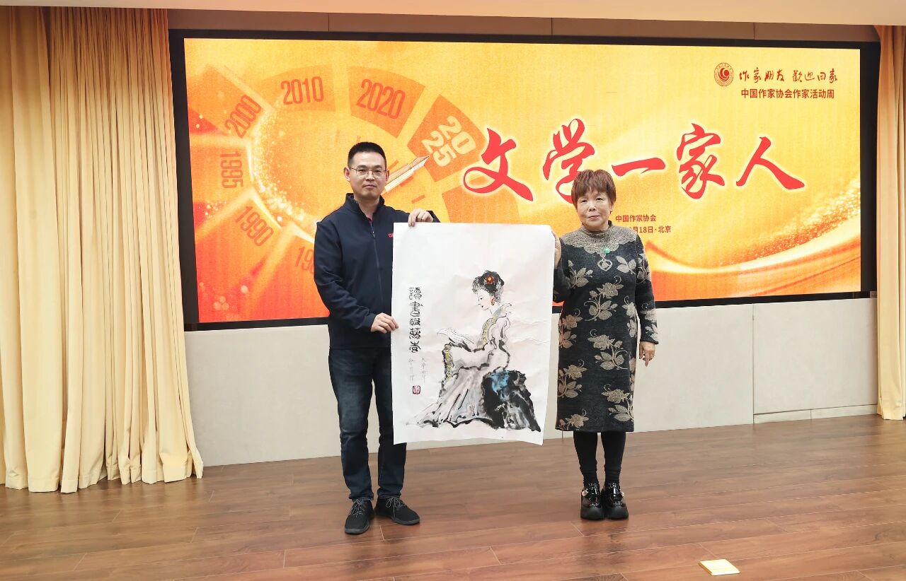活动现场,大家还互相赠送了书画作品,“回家”的老作家们与鲁院高研班学员互赠书法、绘画作品。诗人郭新民特意为此次作家活动周创作了一首古体诗:“金秋载誉上京华,文苑归巢话岁嘉。历尽沧桑耕沃土,新程再续锦云霞。”他以书法作品的形式将其赠予中国作协。