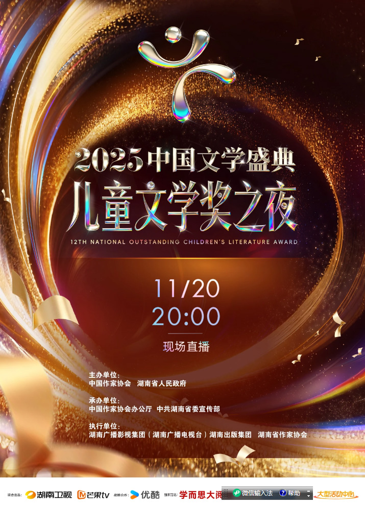 “2025中国文学盛典·儿童文学奖之夜”将于2025年11月20日晚8点,在长沙隆重启幕,湖南卫视、芒果TV、北京卫视将现场直播这场盛典,中国作家网、《文艺报》也将同步直播。