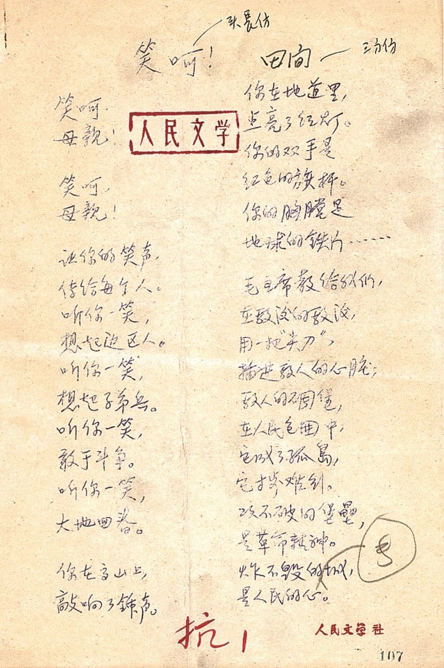 “一九三七年下半年,我由上海来到武汉,准备北上,前赴延安。住在武昌的一家小旅馆里,一夜之间,一气写成这首长诗。”在中国现代文学馆收藏的手稿《〈给战斗者〉写作前后》中,田间这样回忆了那个多年前的夜晚,这份回忆也带我们走进了“擂鼓诗人”田间的创作故事。