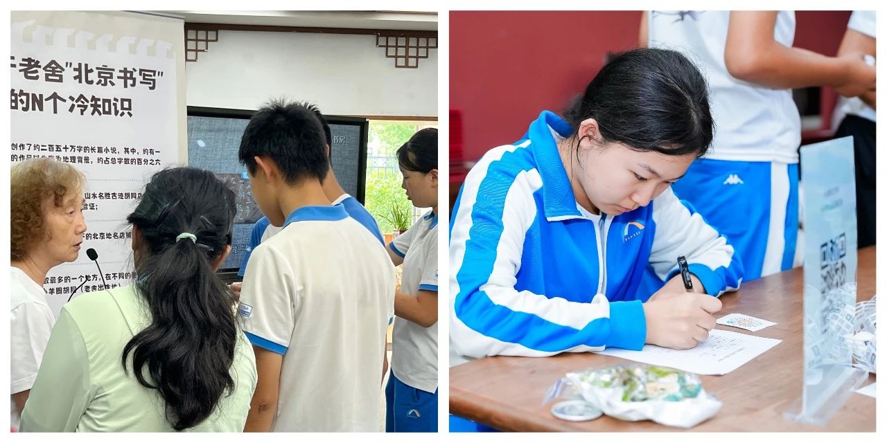 现场气氛热烈,有学生表示:“扭蛋答题的形式特别有趣,答对了可以亲手做一枚自己喜欢的老北京图案的“吧唧”,非常有参与感。我今天和同学们通过答题学到了老舍先生抗战时期的经历,还知道了《骆驼祥子》的英文名和其他拓展知识,特别有成就感!”