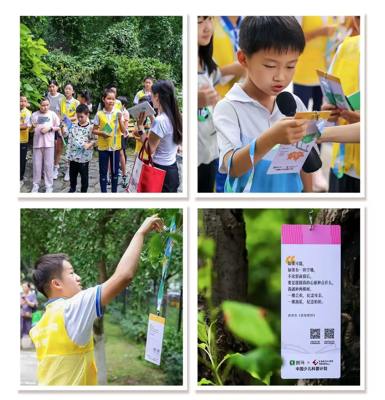 活动延续文学馆“文章万物”的跨学科设计理念,特别策划“植物×文学科普”环节。由文学馆社教“小王老师”带领孩子们漫步大师的文学花园,观察植物形态、学习植物知识,尝试用作家的眼光观察世界、走进作家笔下的“文学自然”,让自然与文字在童心中共舞、于自然中感受文学之美。梧桐树旁,孩子们郎声读出汪曾祺的“一叶落而知天下秋,梧桐是秋的信使”,樱花树下,孩子们亲手系上写有冰心诗句的植物挂牌,赋予大师花园里的植物更多的诗意。