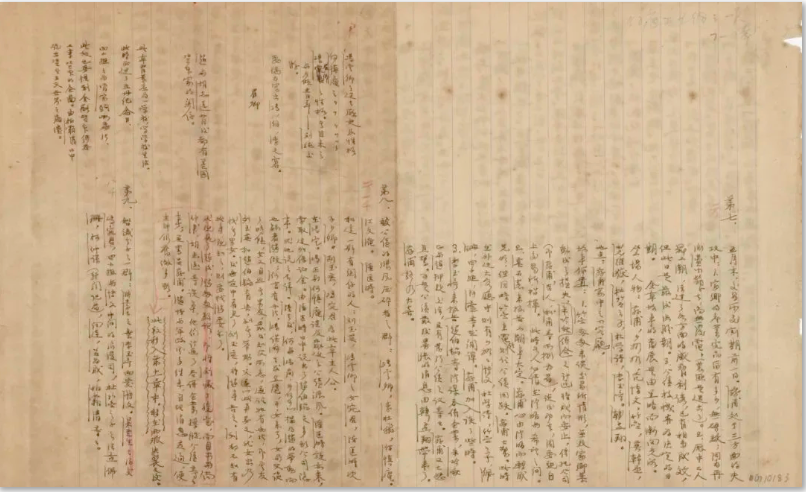 茅盾长篇小说《子夜》手稿是在抗日战争中幸存的珍贵作家手稿之一。1932年一·二八事变中,日军轰炸上海,上海商务印书馆被毁,茅盾交给《小说月报》编辑部的《子夜》手稿在战火中化为灰烬。所幸,损毁的《子夜》手稿是茅盾夫人孔德沚的手抄本,原稿还藏在茅盾家中。1937年抗日战争全面爆发,茅盾在离沪之际将手稿交给亲人沈仲襄保管,手稿被放入交通银行的保险柜中,再度幸免于战火摧残,而且“200多页稿纸无一张破损遗失”,堪称奇迹。