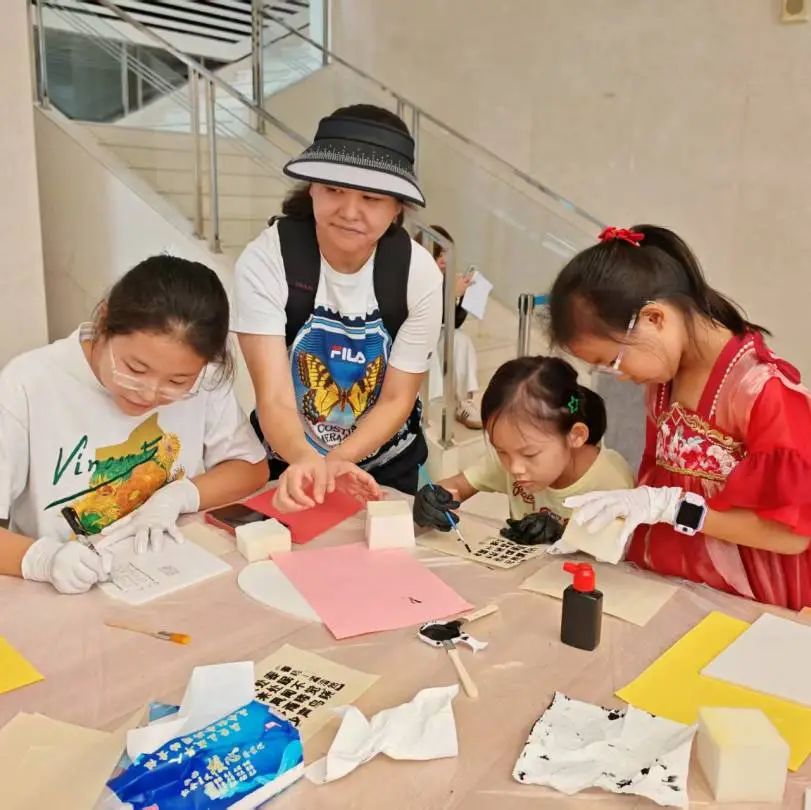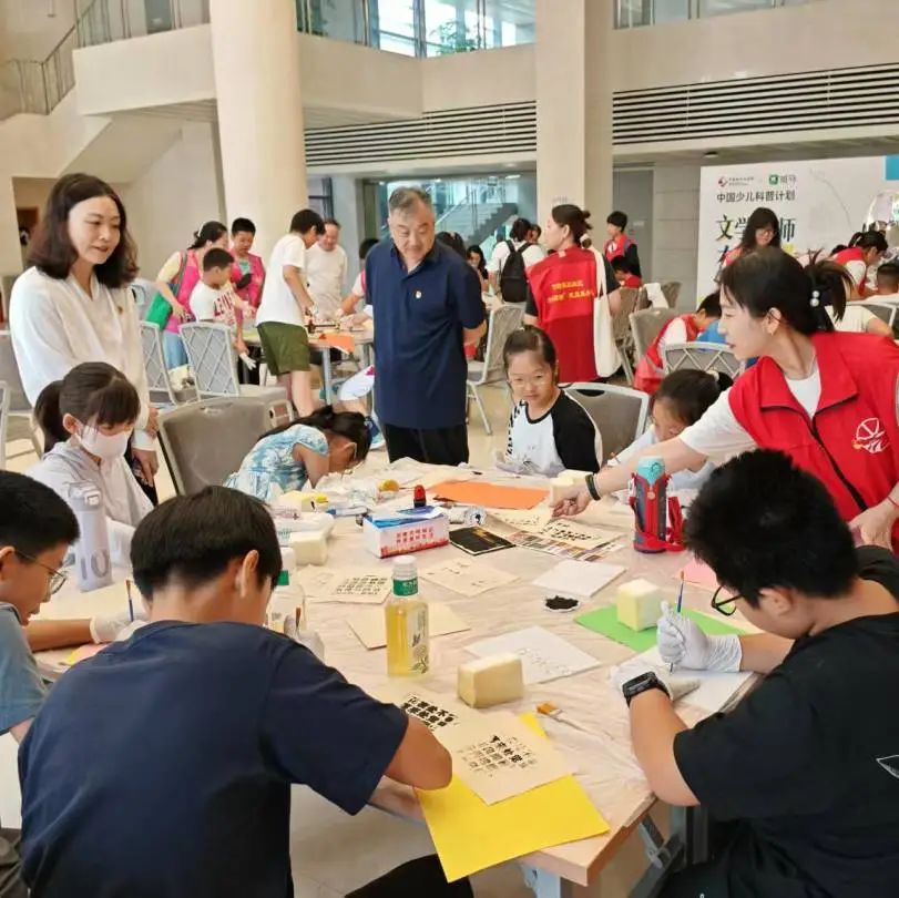 在木版画拓印区,张卉委员与孩子们一起,将油墨均匀刷在刻有中国现代文学馆图案的木版上,再覆盖宣纸进行拓印。随着一幅幅清晰的图案被成功拓印出来,孩子们喜悦之情溢于言表,纷纷展示自己的作品。