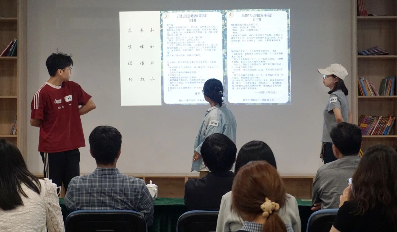 活动现场,中国作家协会会员、青少儿文学作家常聪与中国作家协会会员、知名编剧源子夫依托孙犁先生的小说《荷花淀》《芦花荡》构建起了一个“角色驱动-沉浸推理-集体决策”的立体化“经典文学宇宙”阅读场景。活动以“寻找神秘人”为主线,参与者化身“传承者”,通过分析文本细节、推理人物关系,逐步揭开孙犁先生小说《荷花淀》中隐藏的故事线索。三名学生现场生动演绎了水生、水生嫂与撑船老人等角色,通过情景再现推动剧情发展。现场师生积极参与推理,最终成功揭晓“神秘人”身份,“传承者”队伍获胜。全体参与者齐声诵读传承誓言,将活动推向高潮。