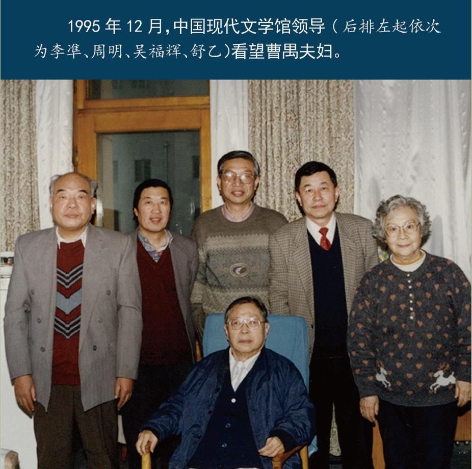 1995年12月,中国现代文学馆领导(后排左起依次为李凖、周明、吴福辉、舒乙)看望曹禺夫妇